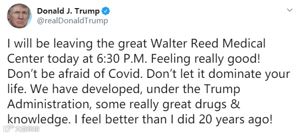 特朗普在推文中说,“我将于今天下午18时30分离开沃尔特·里德医疗中心。感觉真的很好,别害怕新冠病毒,不要让它主宰你的生活。在特朗普政府的领导下,我们研发许多很好的药物并有了进一步的认识。我比20年前感觉还要好”。