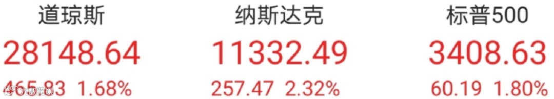 截至收盘,道指涨1.68%报28148.64点,标普500涨1.8%报3408.6点,纳指涨2.32%报11332.49点。