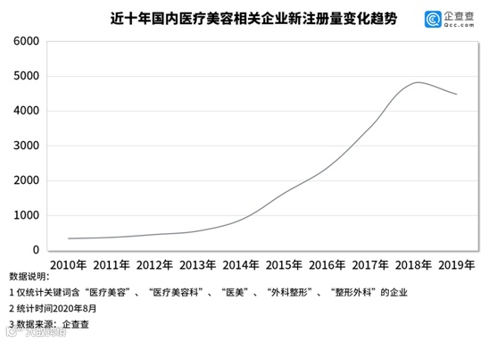 记者从企查查获得的数据显示,目前我国共有2.5万家医美相关企业。近十年(2010年-2019年)来,相关企业新注册量逐年攀升。2018年之后,每年企业新注册量均突破4000家,其中2019年为4482家,比十年前数据增长1226%。