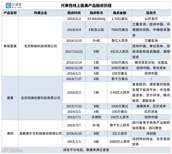 从医美APP融资历程来看,线上医美依旧是资本的宠儿。据企查查数据显示,新氧医美、更美等医美平台,2013年-2019年,几乎每年都有新的融资,融资金额基本在千万级人民币以上。2019年5月,互联网医美平台新氧在美国纳斯达克上市,成为“互联网医美第一股”,以上市当天的发行价计算,新氧市值达到13.8亿美元。