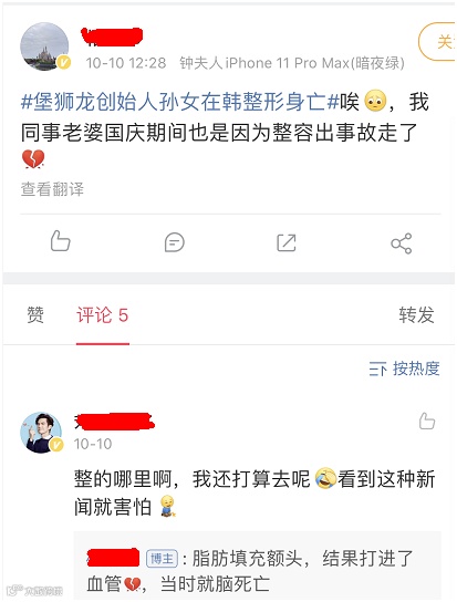 在相关网帖下面,有不少网友讲述整形意外事故。如一位网友表示,她同事老婆国庆期间也是因为整容出事故走了,“脂肪填充额头,结果打进了血管,当时就脑死亡。”