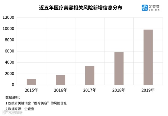 这些被曝光的事故可能只是冰山一角。因缺乏统一的监管标准,医美行业暗含了极大的法律风险,据企查查数据显示,与医疗美容相关的风险信息超3万条。近五年来,医美相关风险信息逐年攀升,2019年的相关风险信息是2018年的1.7倍。