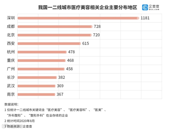国内医疗美容相关企业主要分布在一二线城市。企查查数据显示,一二线城市医疗美容相关企业占全国总量的60.9%,其中深圳以1181家高居榜首,成都、北京分别以728家、720家紧随其后,西安、杭州、重庆、广州、长沙、武汉、南京分列4-10名。