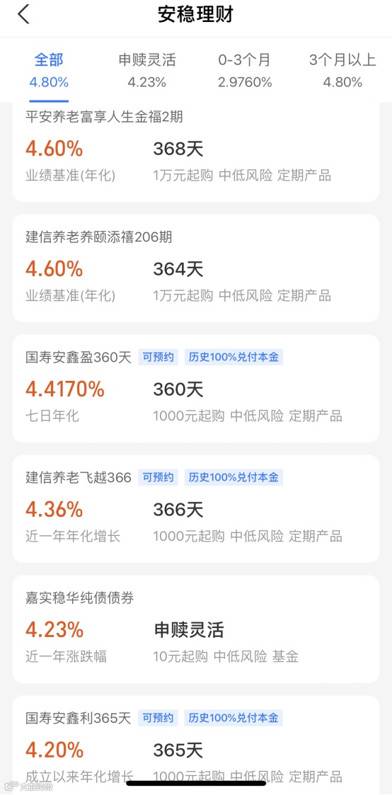 在微信支付-理财通-稳健理财的页面中,点击“保险类”,可以看到按期限不同而分类的一类名字中都带有养老的产品,均为中低风险,1000元起购。