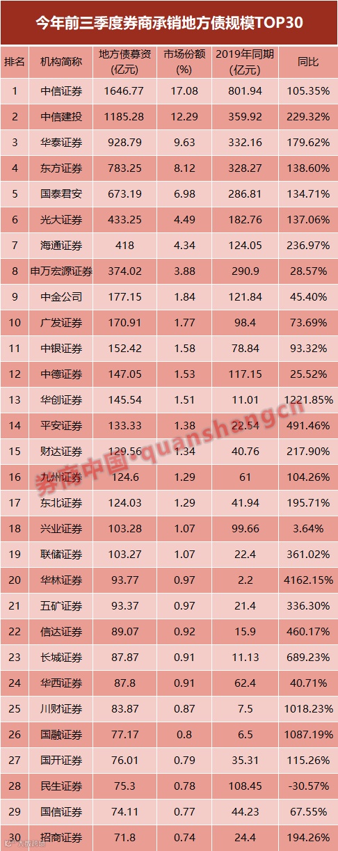 特别值得关注的是,承销规模排名靠前的券商均在原有基数上有大的突破,其中中信建投、海通证券前三季度承销的地方债规模同比增幅均超200%。