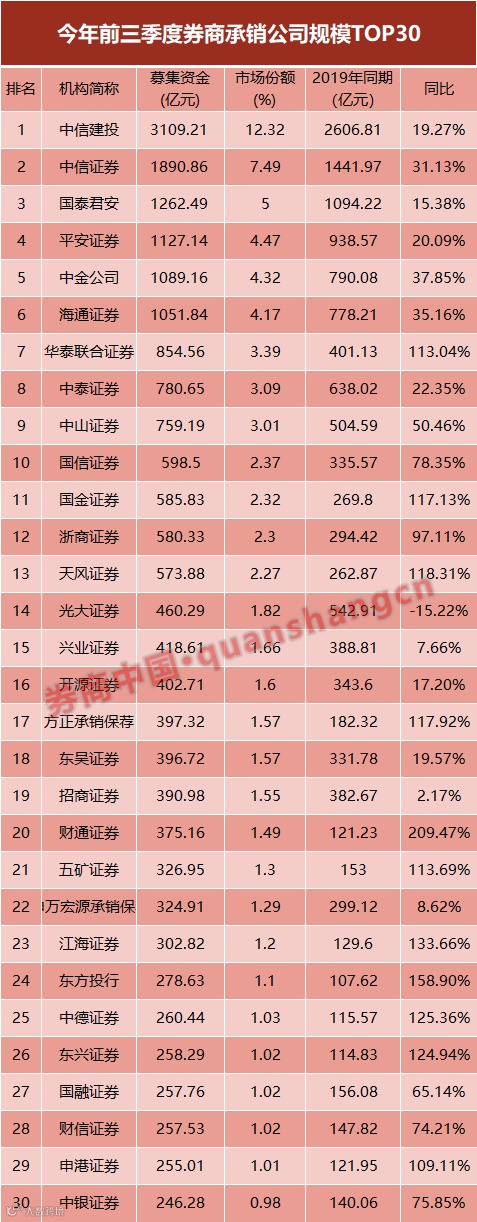 中信建投证券、中信证券两家位居“双雄”,前三季度承销的发债规模均超过7000亿元;国泰君安承销发债规模位4613亿元,位居第三;中金公司、海通证券承销发债规模均超3000亿元,跻身前五。