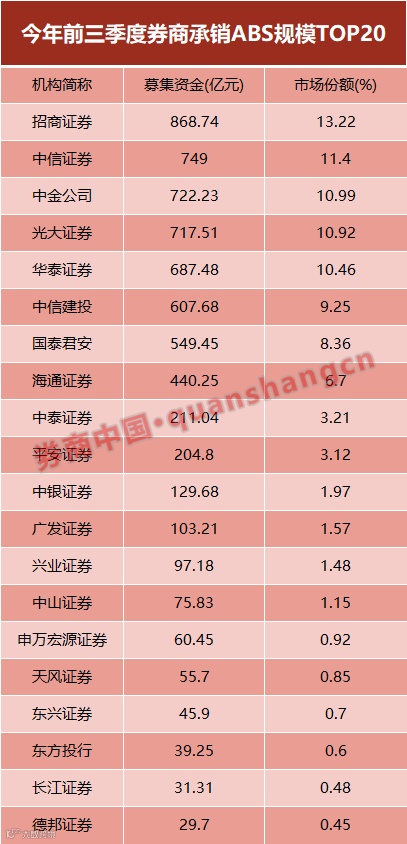 据wind前三季度债权市场统计,券商合计承销的ABS规模为6570亿元,同比下滑13.79%。