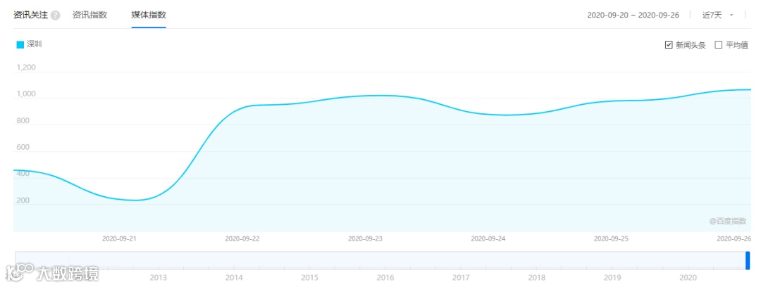 离国庆和中秋还有半周时间,但从上周末开始,深圳的节日气氛已经明显浓厚起来,主要交通干道上国旗飘舞,前海附近的一些小区也是张灯结彩,喜庆程度甚至有超过春节的意味。券商中国记者点开百度指数查了查,发现最近深圳的媒体指数也已悄然见底,并在最近几日明显回升。