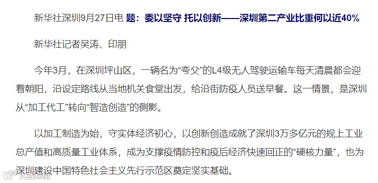 一是新华社9月27日突然发了一篇题为《委以坚守 托以创新——深圳第二产业比重何以近40%》。文章指出,以加工制造为始,守实体经济初心,以创新创造成就了深圳3万多亿元的规上工业总产值和高质量工业体系,成为支撑疫情防控和疫后经济快速回正的“硬核力量”,也为深圳建设中国特色社会主义先行示范区奠定坚实基础。深圳市副市长聂新平还表示,深圳已制定工业物联网、云计算等一批产业发展计划,并将建立重点产业链“链长制”。