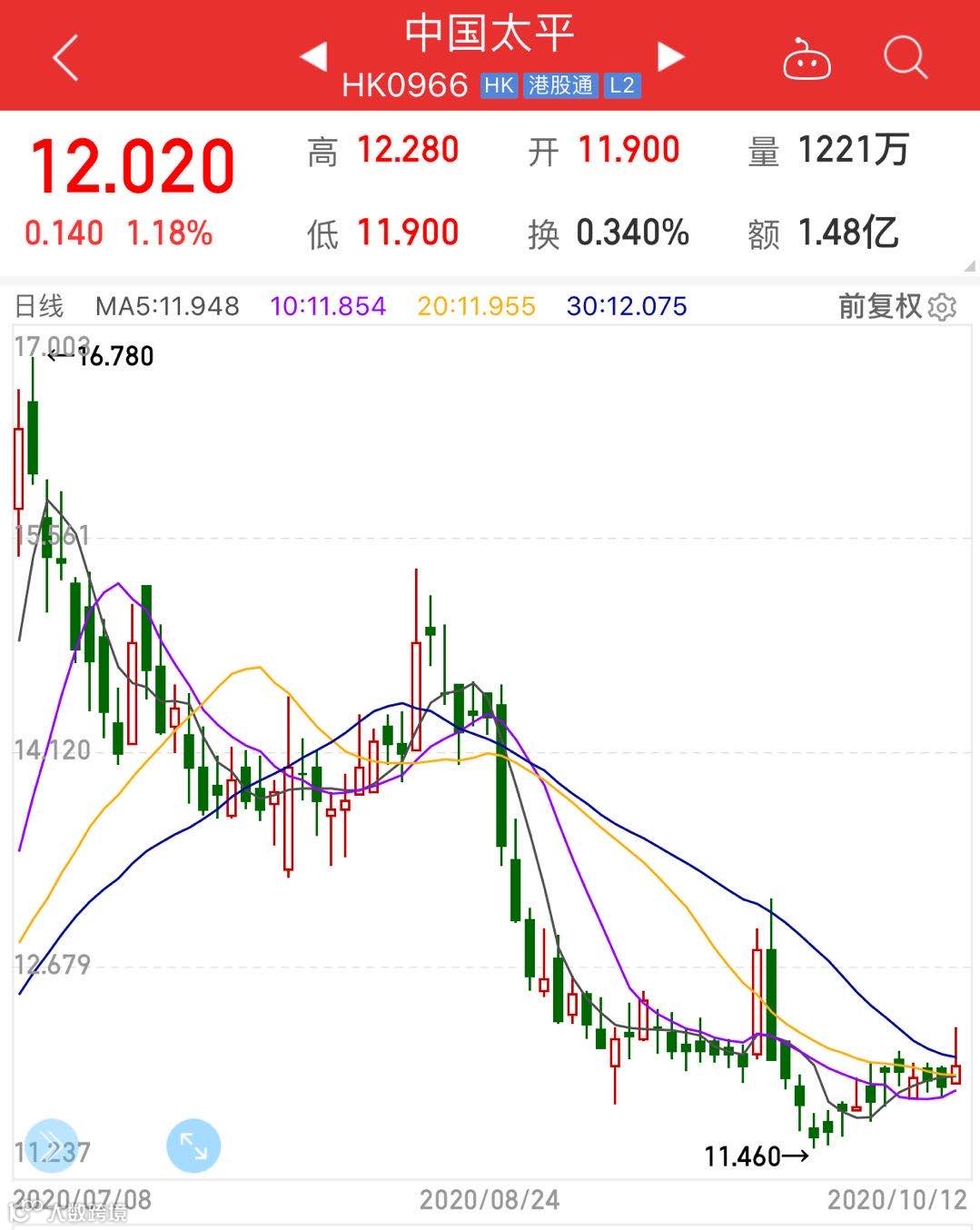 今年上半年,中国太平股价一度跌至10.9港元,创下6年来最低价。截至最近一个交易日收盘,中国太平股价为12.02港元。