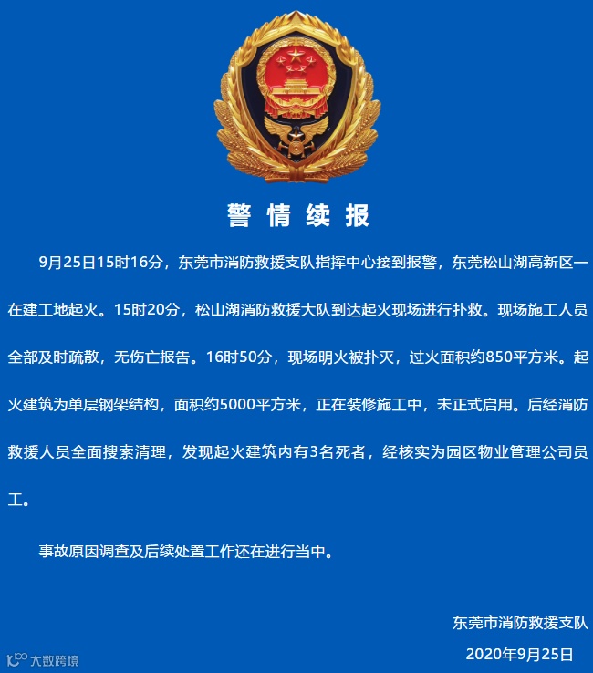 随后,东莞市消防救援支队发布警情通报,称9月25日15时16分,东莞市消防救援支队指挥中心接到报警:位于东莞市松山湖阿里山路一建筑发生火灾。起火建筑为钢结构建筑,未正式启用,主要燃烧物质为吸音棉。截至下午16:50,现场火势已扑灭。
