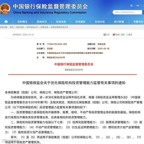 10月10日,银保监会发布了《关于优化保险机构投资管理能力监管有关事项的通知》,决定进一步深化“放管服”改革,取消投资管理能力的备案管理,将保险机构投资管理能力管理方式调整为“公司自评估、信息披露和持续监管相结合”,对信息披露的内容、形式、方式、频次等进行了明确,并规定了违规情形和责任,全面压实保险机构主体责任。