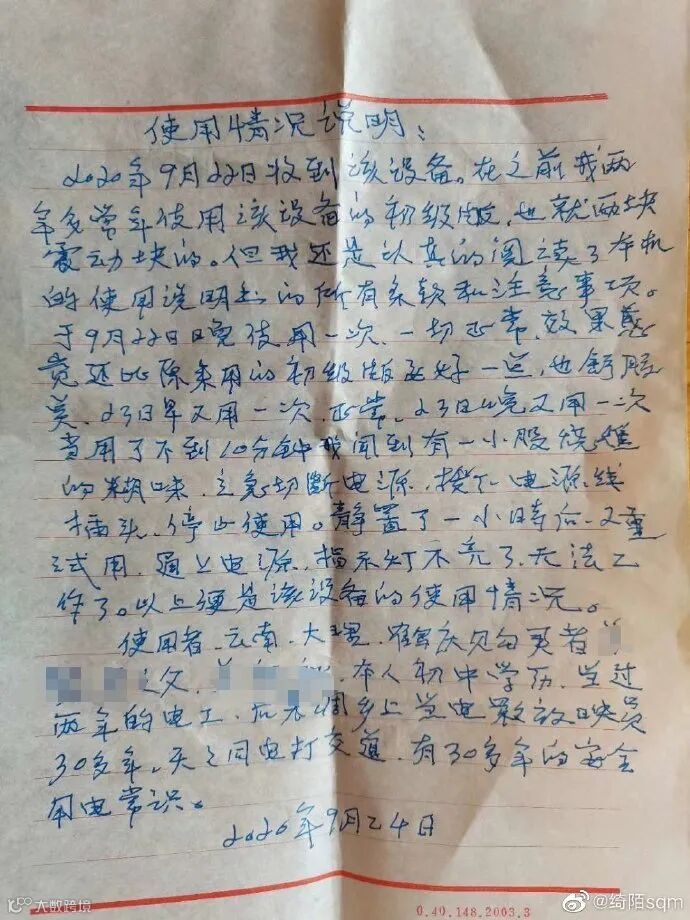 使用者:云南大理鹤庆,购买者:XXX之父XXX。本人初中学历,当过两年电工。后来调乡上当电影放映员30多年,天天同电打交道,有30多年的安全用电常识。