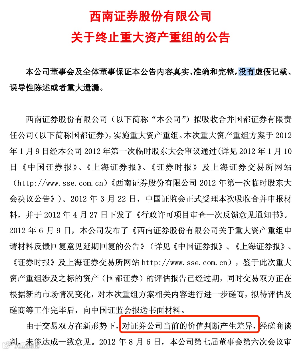 更为让人意难平的,则还要数2012年8月,历时十七个月的“上市券商并购第一案”宣告失败。西南证券当日发布公告称,终止并购的原因是,“由于交易双方在新形势下,对证券公司当前的价值判断产生差异,经磋商谈判,未能达成一致意见。”