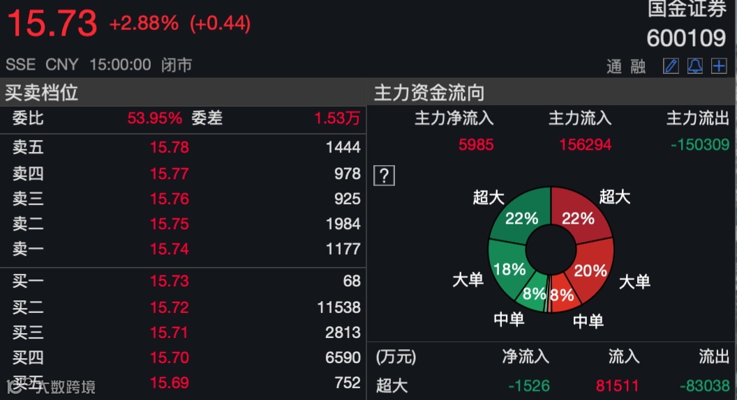 国金证券股价最终收于15.73元,单日上涨2.88%。
