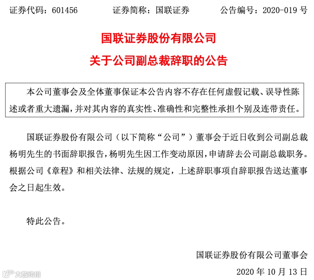 而值得注意的是,就在双方复牌的13日晚间,国联证券公告称,其副总裁杨明“因工作变动原因,申请辞去公司副总裁职务”。公告中并未提到杨明辞职后是否还会在公司其他部门或子公司任职。