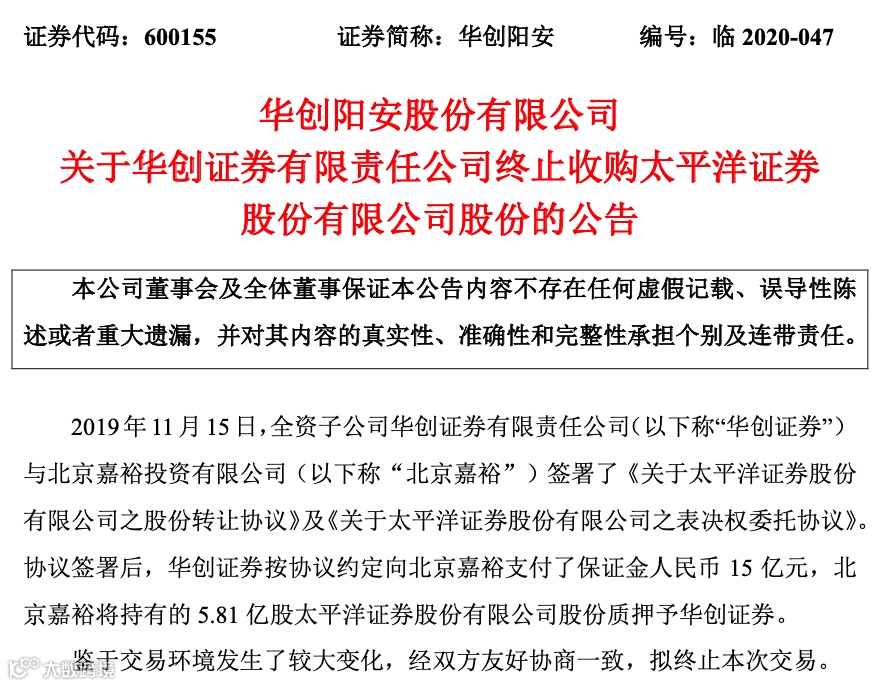 6月3日晚间,上市公司华创阳安发布公告称,董事会同意子公司华创证券终止收购太平洋证券股份,原因是“交易环境发生了较大变化”。根据当时的收购方案,转让标的交易单价为5.50元,相比于收购方案发布当日太平洋3.04元的股价存在较高溢价。