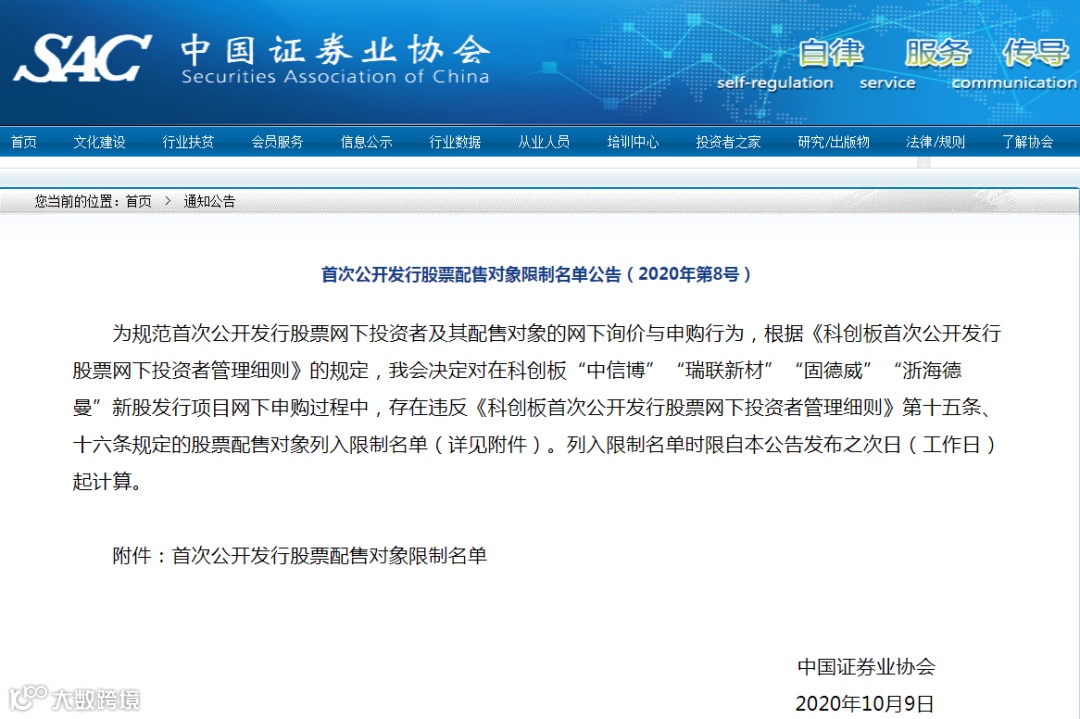中国证券业协会表示,为规范首次公开发行股票网下投资者及其配售对象的网下询价与申购行为,决定将在科创板“中信博”“瑞联新材”“固德威”“浙海德曼”新股发行项目网下申购过程中,存在违反《科创板首次公开发行股票网下投资者管理细则》第十五条、十六条规定的股票配售对象列入限制名单。