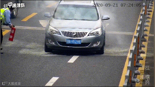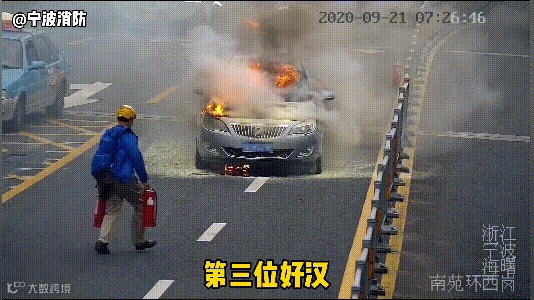 奔向起火的轿车,一阵猛喷
