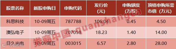 本周(周五)将有4只新股发行,分别是科思科技、澳弘电子、日久光电、地铁设计。