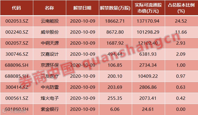 数据显示,本周(10月9日)共有9家公司限售股陆续解禁,合计解禁量3.03亿股,按9月30日收盘价计算,解禁市值为27.5亿元。
