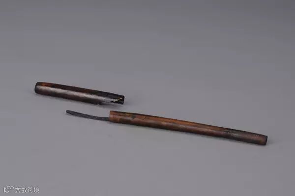 由于毛笔易损,不好保存,故留传至今的古笔实属凤毛麟角。墓地一下子出土了毛笔五支,非常难得。“毛笔出土时,都放置在漆文具盒中,笔杆和笔套都是竹制,式样与现代竹杆、竹帽毛笔相似。笔杆、笔帽上面有遗存的墨迹,可以看出这五支毛笔都曾经使用过,属于随葬的实用品。遗憾的是,五支毛笔的笔毛都已经没有,仅残留笔芯且长短不一,都是用麻一类的植物纤维制成的。”汪炜说道。