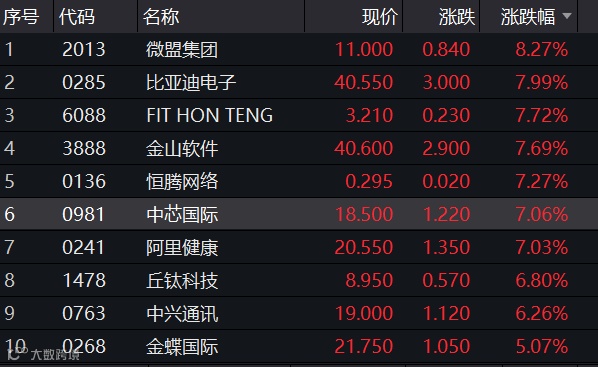 其他科技股方面,比亚迪电子大涨近7%、华虹半导体涨超3%,金山软件涨7.69%,中兴通讯涨超6%。