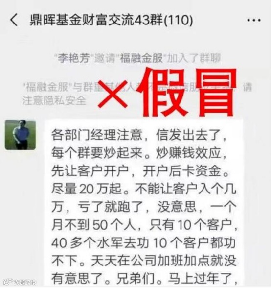 去年11月,有关“鼎晖基金财富交流43群”微信群的一个截屏图片在不少投资群疯传。该截屏图片里的聊天信息称:“各部门经理注意,信发出去了,每个群要炒起来,炒赚钱效应,先让客户开户,开户后卡资金。尽量20万起,不能让客户入个几万,亏了就跑了,没意思,一个月不到50个人,只有10个客户,40多个水军去攻10个客户都攻不下。天天在公司加班加点就没有意思了。兄弟们,马上过年了,争取每个人保底开10张单,10张单,客户亏损100万,你们也有10万工资过年,加油兄弟们,群一定不能冷。”