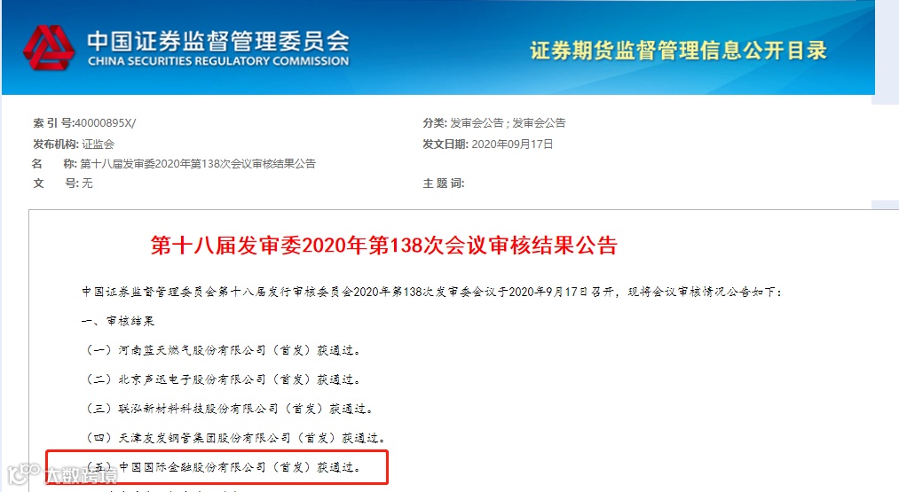 9月11日,证监会官网信息显示,证监会第十八届发行审核委员会定于9月17日召开2020年第138次发行审核委员会工作会议,中金公司首发上会。在毫无悬念的等待中,9月17日晚间,证监会公告,中金公司及其他4家公司首发获通过。