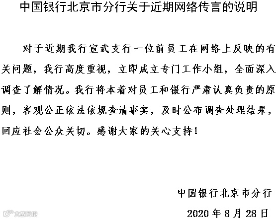 针对此事,中行北京分行今日发布声明称:我行高度重视,立即成立专门工作小组,全面深入调查了解情况。中国银行北京分行表示,将本着对员工和银行严肃认真负责的原则,客观公正依法依规查清事实,及时公布调查处理结果,回应社会公众关切。