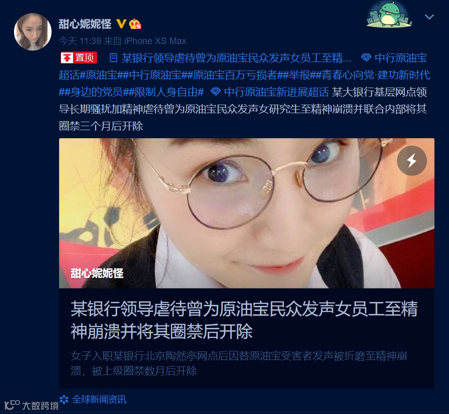 8月26日,一位微博名为@甜心妮妮怪的博主发布实名举报长文,称自己遭受到了中国银行北京陶然亭网点领导长期骚扰加精神压迫,而该领导联合内部人员在将她“圈禁”三个月后从银行开除。