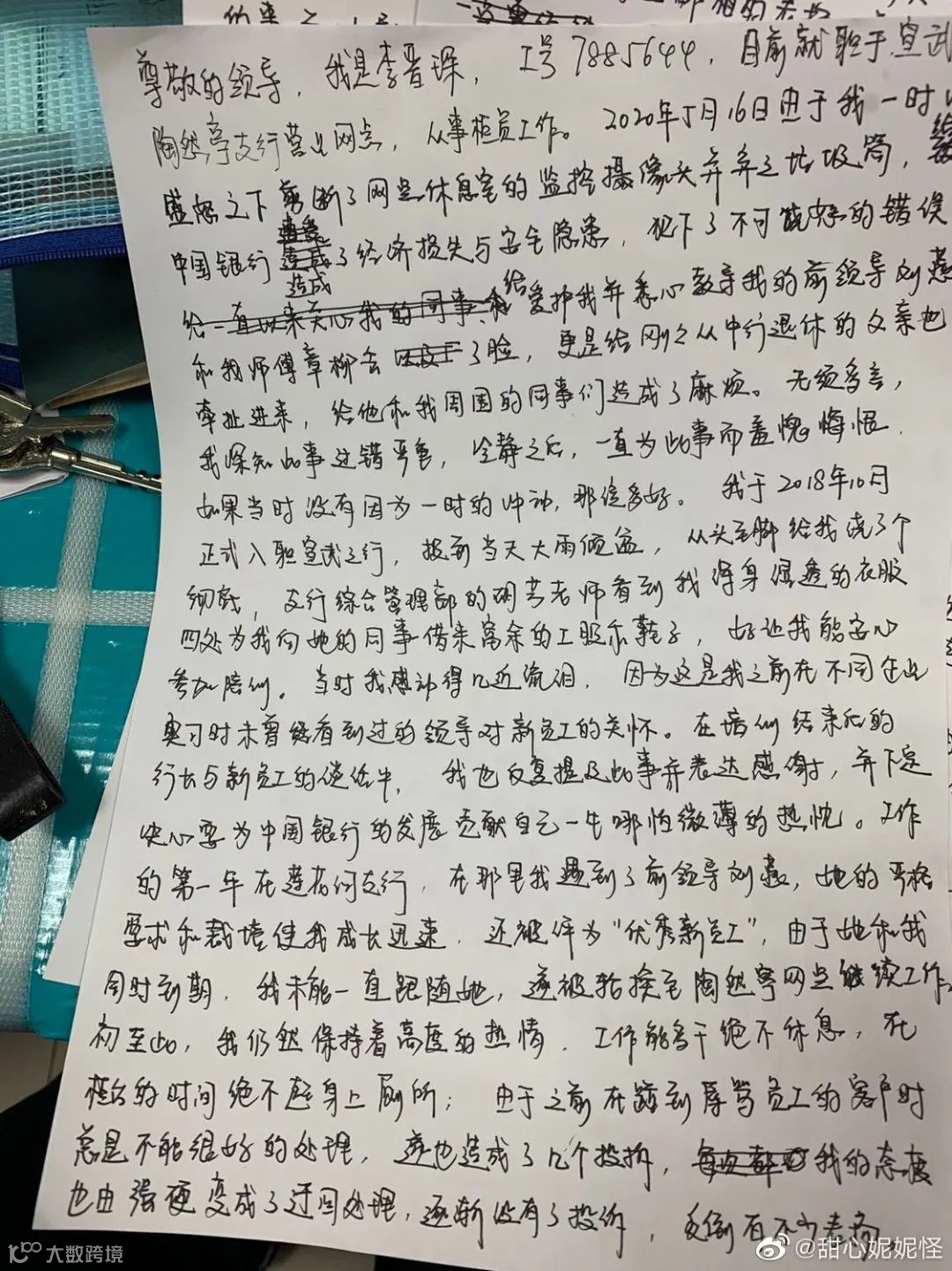 在微博公开的检讨书中,李晋琛称自己就职于中国银行北京宣武支行陶然亭营业部,工号7885644,从事柜员工作。