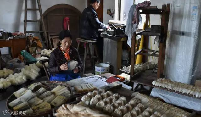 不仅仅是湖笔,文房四宝目前都面临着相同的窘境:后继乏人。为了解决这个问题,当地政府部门出台工资扶持政策,鼓励企业培训新工人,第一年给予每名工人1500元月工资补助,第二年每月1200元,第三年每月1000元。图为湖笔一条街上的这间铺面原来也是销售湖笔的店铺,因为生意不好,该做了丝巾加工车间,工人也是外来的。