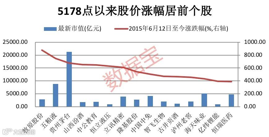翻倍个股不仅仅是以上食品饮料行业个股(只考虑5178点以前上市股),数据宝统计显示,自5178点以来股价翻倍个股有123只,涨幅居首的是牧原股份,自2015年6月12日至今股价涨超8.5倍,中公教育、恒立液压、隆基股份、中国中免股价涨幅均超过5倍。与此同时,跌幅较大的以ST股、退市股为主。