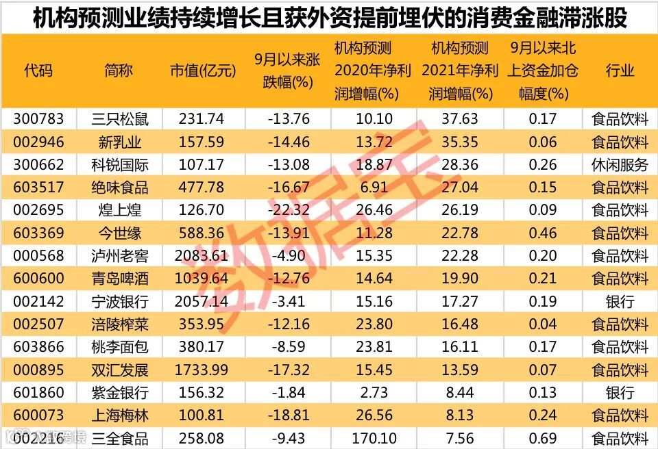 数据宝统计显示,食品饮料、休闲服务以及银行板块,9月份以来跑输大盘且9月份获北上资金加仓,机构预测2020年、2021年净利润实现增长股仅有15只,包括4只千亿市值股泸州老窖、宁波银行等。从市场表现看,跌幅较大的有煌上煌、上海梅林、双汇发展及绝味食品,4股9月份以来跌幅均超过15%,紫金银行、宁波银行及泸州老窖跌幅均低于5%。