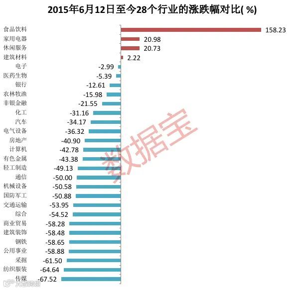 从行业来看,数据宝统计显示,自2015年6月12日至2020年9月18日,28个申万行业指数跌幅超过50%的行业有11个,传媒、纺织服装、采掘行业跌幅均超过60%,银行、非银金融行业跌幅相对较小。