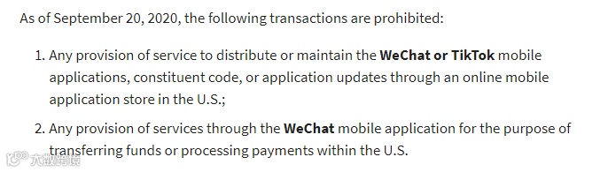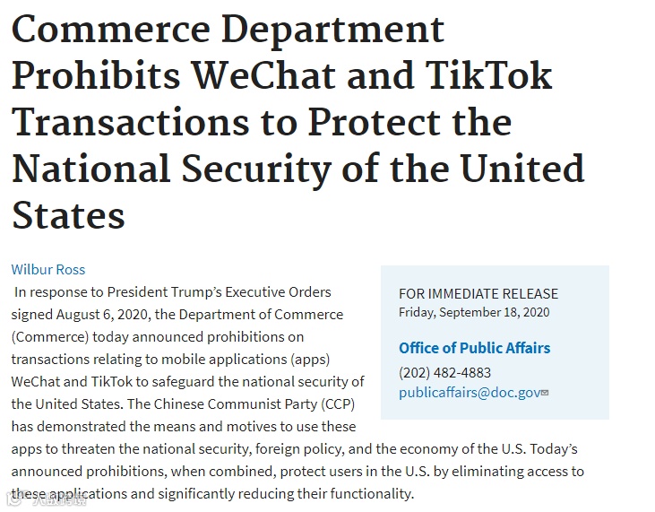 美国商务部发布声明称,从9月20日起,禁止通过美国的在线移动应用程序商店发布或维护微信或TikTok移动应用程序、组成代码或应用程序更新的任何服务;禁止通过微信移动应用程序提供的任何用于在美国境内转账或处理付款的服务。