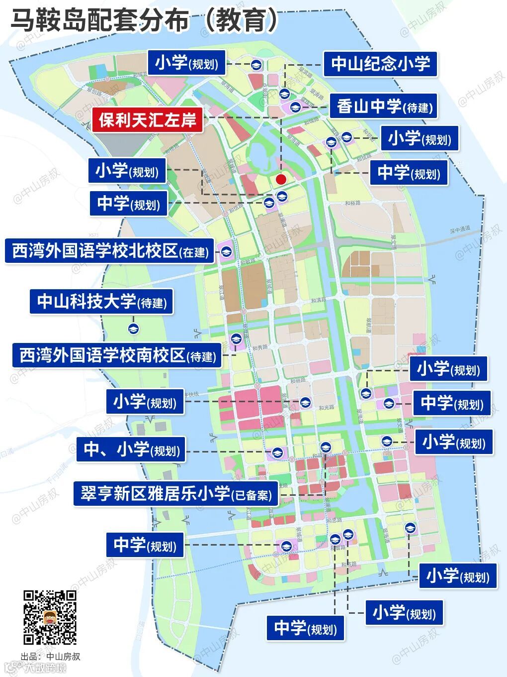 马鞍岛内20个区域规划为教育用地,小学13所,中学9所,幼儿园18所,共40所学校。其中,保利天汇|左岸旁就有1所规划小学和1所规划中学;而直线距离中山纪念小学,也不过1.5公里左右的路程。