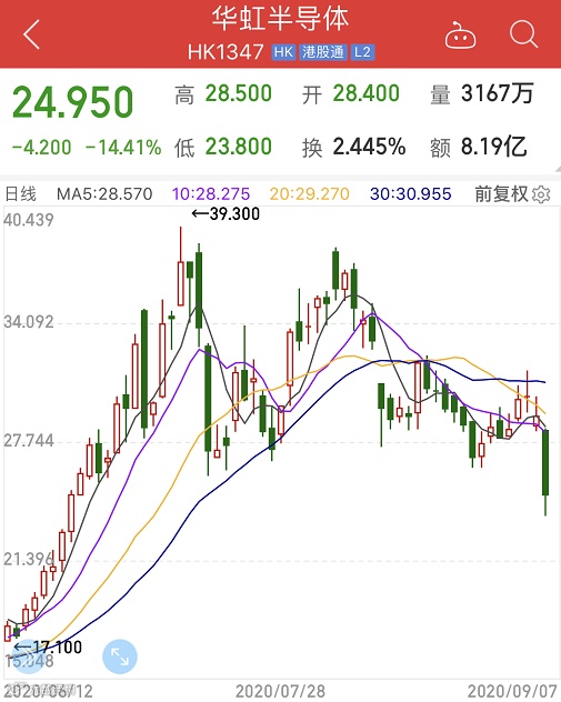 A股市场富瀚微、中微公司、圣邦股份、兆易创新等多只股票大跌。港股华虹半导也现大跌,截至收盘跌幅为14.41%。