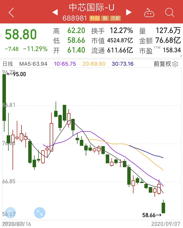 中芯国际A股跌势也较猛,跌幅超过11%,上午的成交额已突破50亿元,超过此前数个交易日全天的成交额。截至收盘,中芯国际A股报收于58.80元/股,跌11.29%,这是中芯国际A股上市以来跌幅最大的一天,也创下了股价新低。