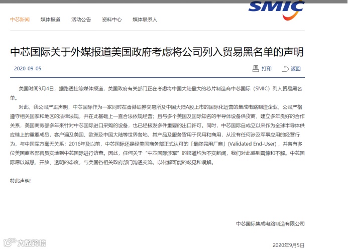 此前,路透社等媒体报道,美国政府有关部门正在考虑将中芯国际(SMIC)列入贸易黑名单,而中芯国际上周六紧急对此类报道进行回应,称任何关于“中芯国际涉军”的报道均为不实新闻。