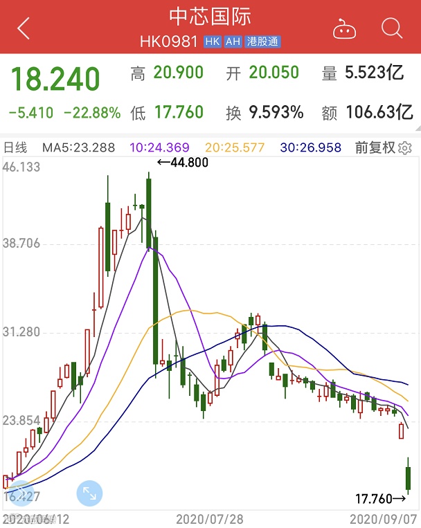 9月7日,中芯国际A股和港股股价大跌,其A股跌幅超过11%,港股盘中跌幅则超过24%。