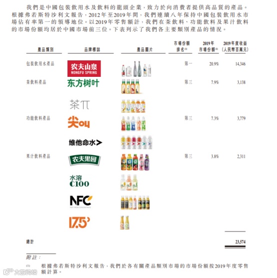 根据咨询公司弗若斯特沙利文报告,2012年至2019年间,农夫山泉连续八年保持中国包装饮用水市场占有率第一的领导地位。以2019年零售额计,其在茶饮料、功能饮料及果汁饮料的市场份额均居于中国市场前三位。