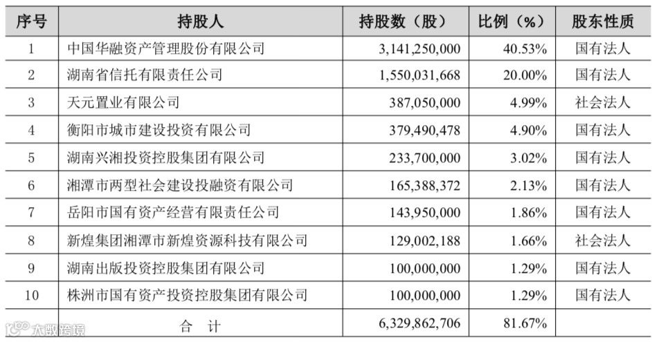 从华融湘江银行2019年年报披露的前十大股东来看,中国华融持有40.53%的股权,为第一大控股股东,其次是湖南省信托有限责任公司持有20%股权为第二大股东。