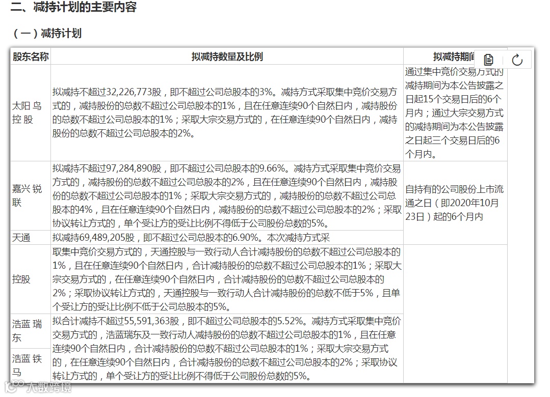 公告披露,嘉兴锐联拟减持原因为基金自身资金安排,太阳鸟控股、天通控股、浩蓝瑞东及浩蓝铁马拟减持原因为公司发展需要。太阳鸟控股拟以集中竞价交易、大宗交易等方式减持;嘉兴锐联、天通控股、浩蓝瑞东及浩蓝铁马拟以集中竞价交易、大宗交易、协议转让等方式减持。