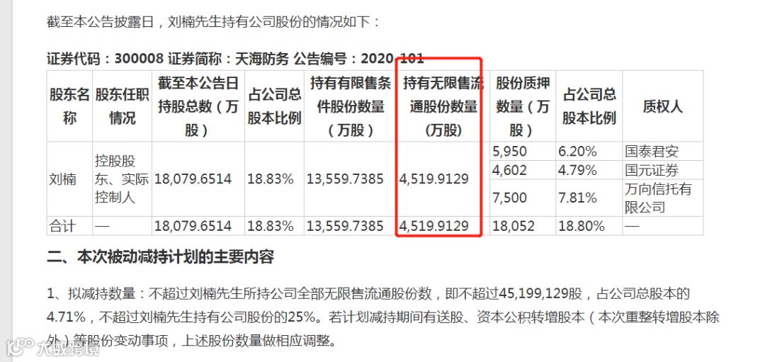 有意思的是,根据天海防务的历史公告,早在2018年10月16日,刘楠将其持有的168.65万股质押给国元证券时,其质押的股份占就已经公司总股本的18.80%,此后也没有解质押和新质押的公告。
