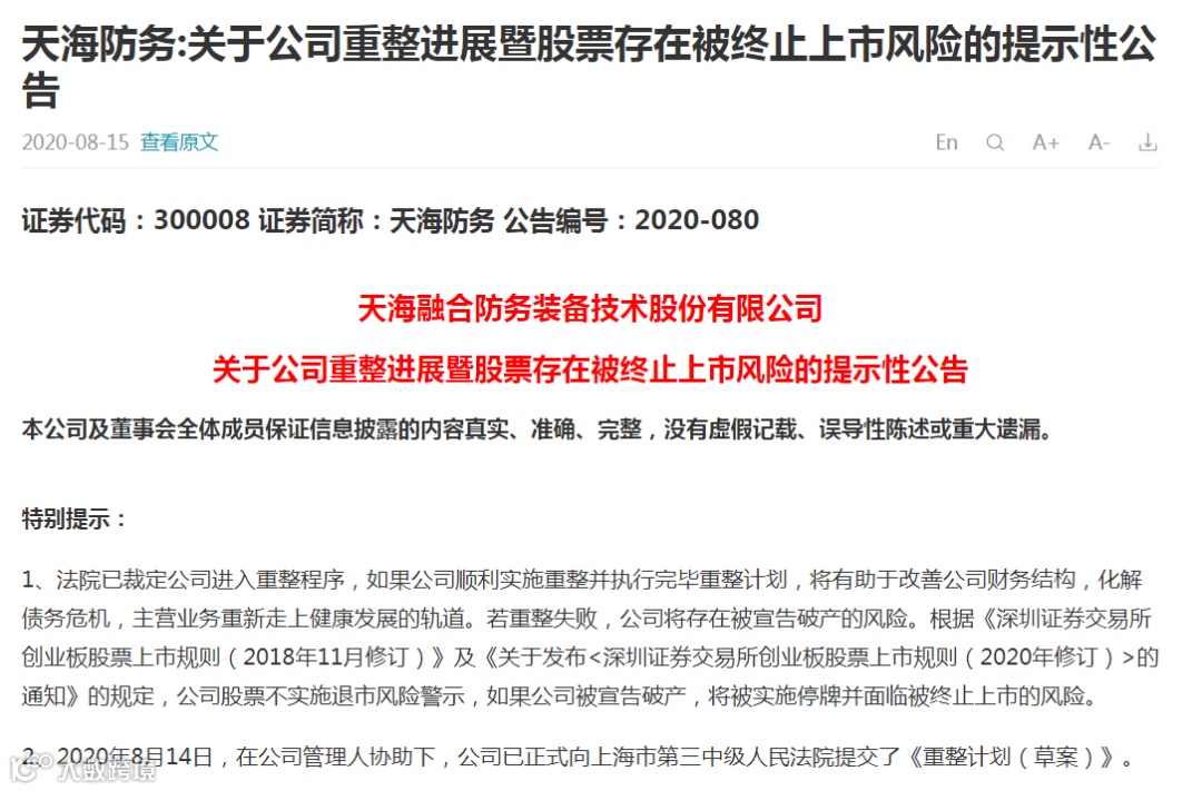 目前,公司已经走上了重整程序,如果公司宣告破产,将被实施停牌并面临终止上市的风险。