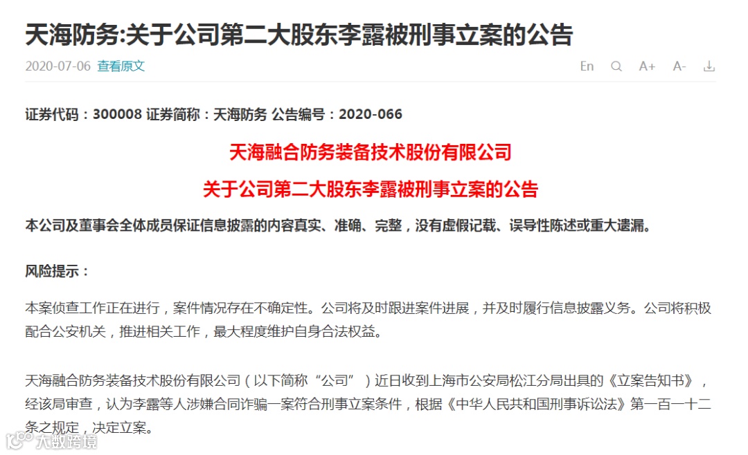 2020年7月份公司近日收到上海市公安局松江分局出具的《立案告知书》,经该局审查,认为李露等人涉嫌合同诈骗一案符合刑事立案条件,决定立案。