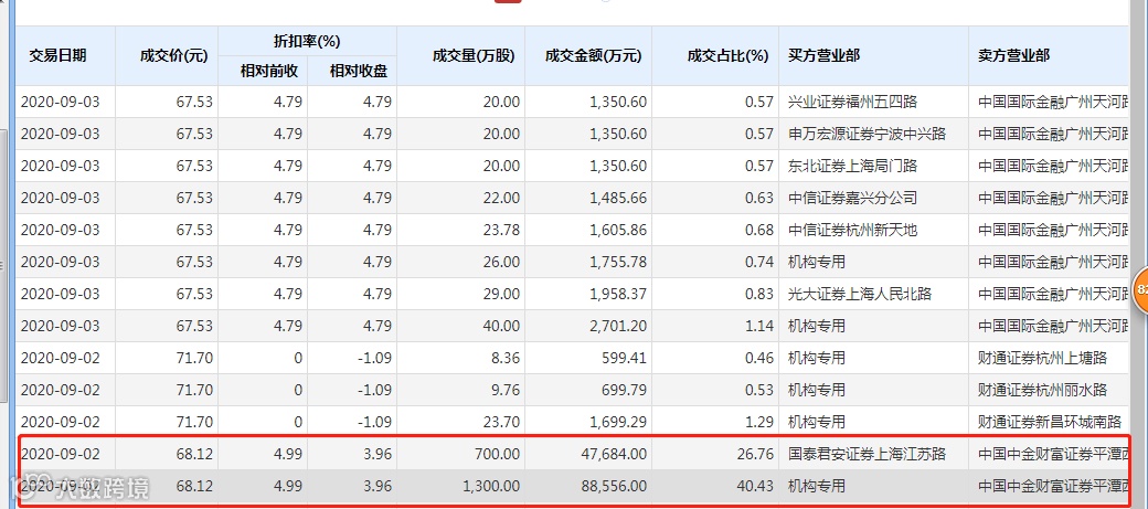 交易的卖出方为中国中金财富证券平潭西航路营业部,买入方分别为机构和国泰君安上海江苏路营业部,其中机构买入1300万股,成交额为8.86亿元;国泰君安上海江苏路营业部买入700万股,成交额为4.77亿元,两笔交易累计金额13.62亿元。