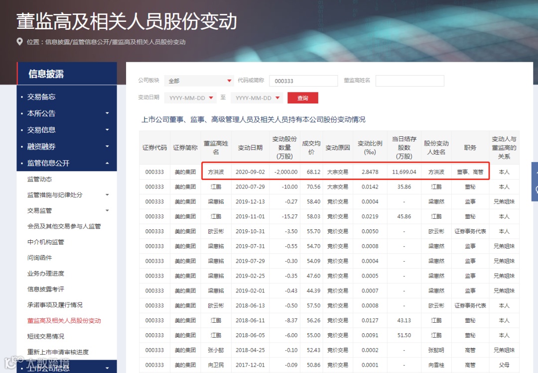 9月3日,深交所网站终于更新了一条重要股东变动信息,美的集团董事长方洪波通过大宗交易减持2000万股,成交均价68.12元,变动后方洪波还持有1.17亿股美的集团。